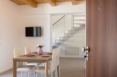Elegante appartamento, pensato per soggiorni brevi all’insegna del comfort e della funzionalità. Gli ambienti, caratterizzati da pavimentazione in gres e riscaldamento a pavimento, offrono un’atmosfera accogliente e contemporanea. Situato al primo piano con accesso da ingresso condominiale, l’appartamento dispone di un ampio soggiorno con divano letto matrimoniale e accesso a due balconi e una cucina completamente accessoriata. Una porta scorrevole consente di suddividere il soggiorno in due ambienti separati, creando all’occorrenza un’ulteriore camera da letto. Il piano è completato da un bagno con doccia e bidet. Una scala interna conduce al piano sottotetto, dove si trovano due camere matrimoniali dotate di finestre Velux automatizzate con tendine oscuranti, che garantiscono luminosità naturale regolabile. Presente un secondo bagno, anch’esso dotato di doccia e bidet.