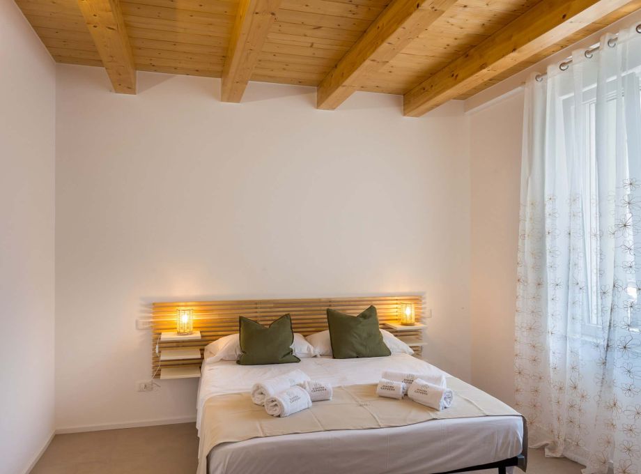 L’ingresso si apre su un’area living attrezzata, dotata di divano letto a due posti, smart TV e ambiente cucina munito di tutte le dotazioni necessarie per un uso quotidiano.