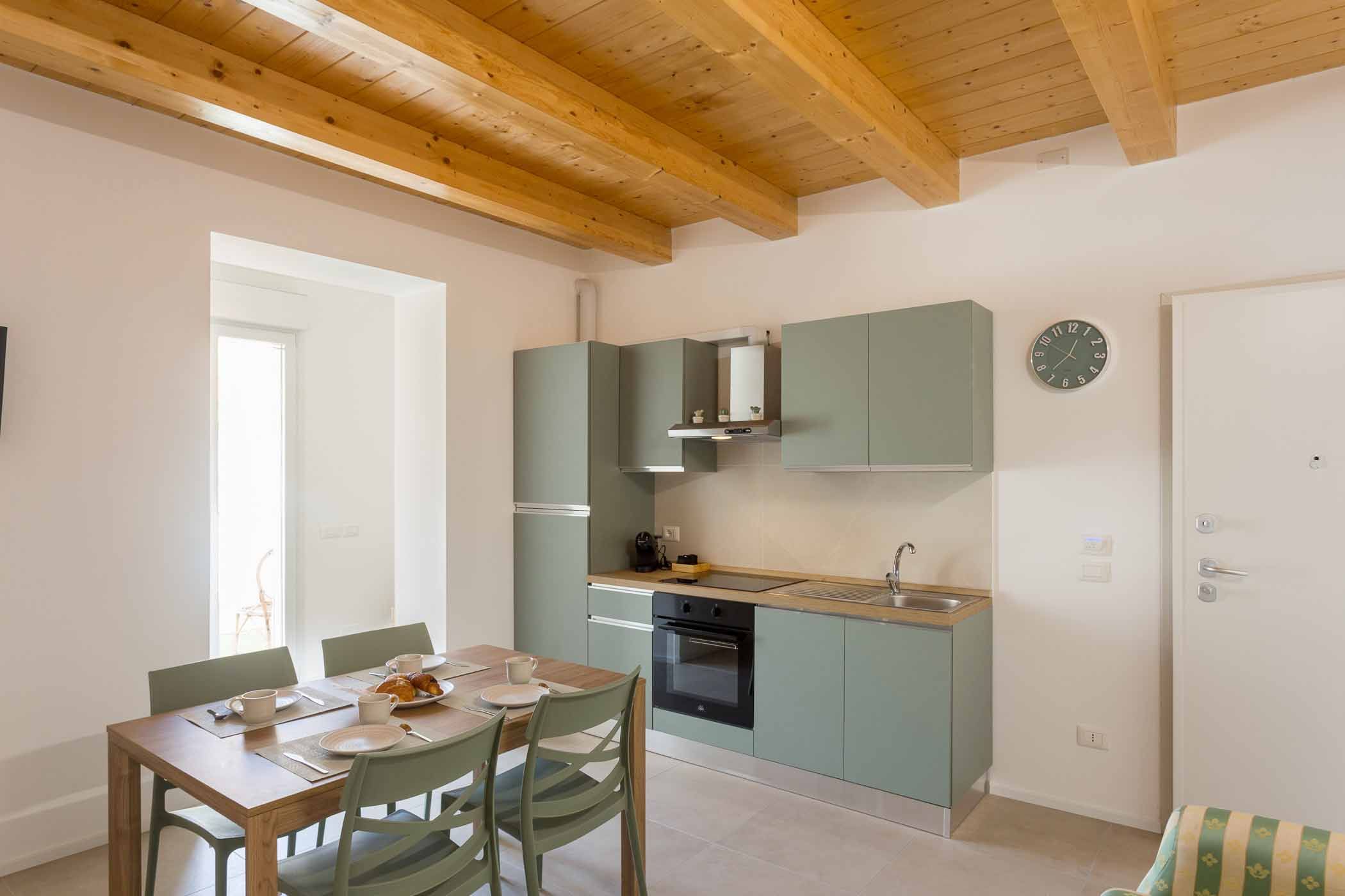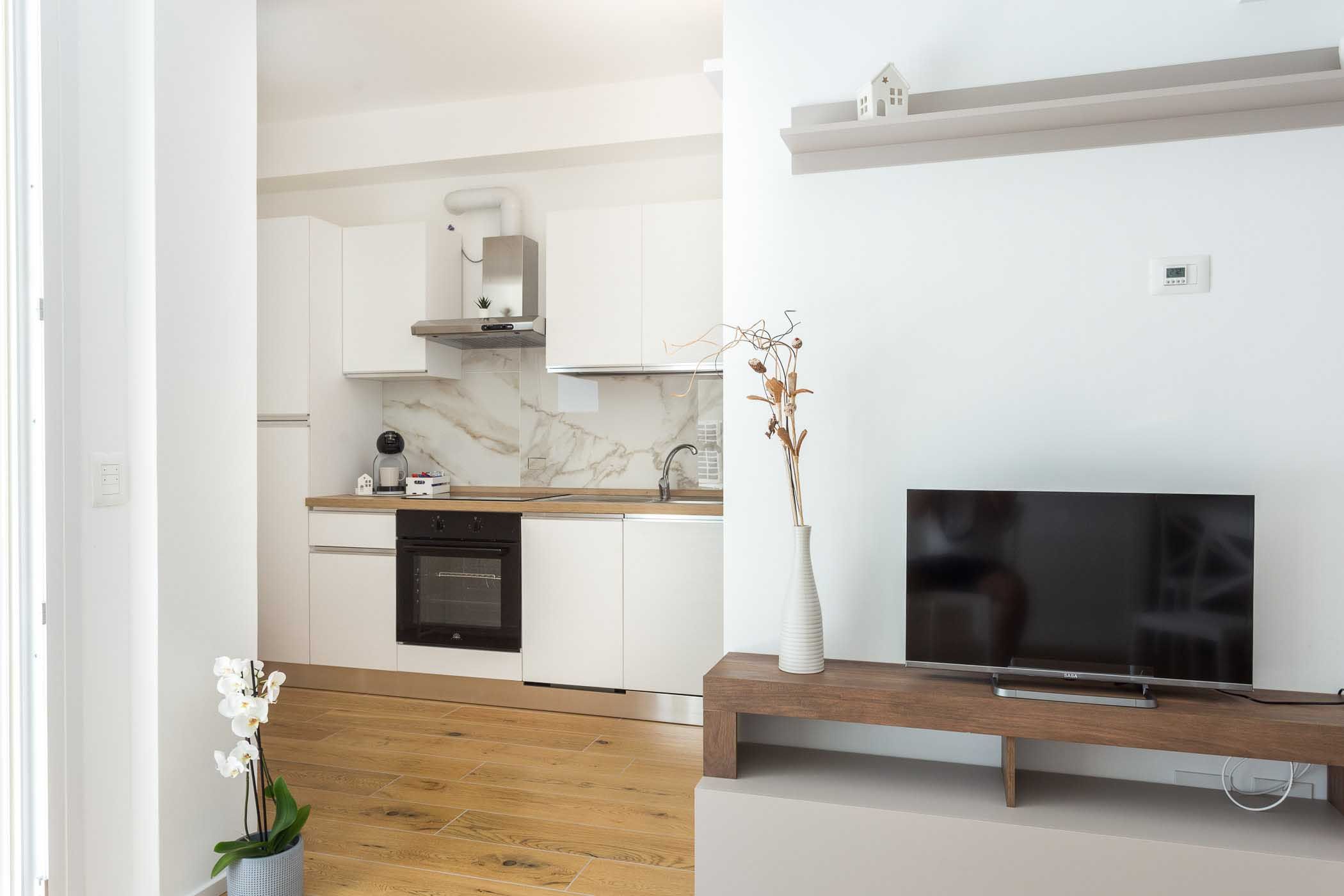 L’ingresso si apre su un’area living attrezzata, dotata di divano letto, smart TV e ambiente cucina munito di tutte le dotazioni necessarie per un uso quotidiano.