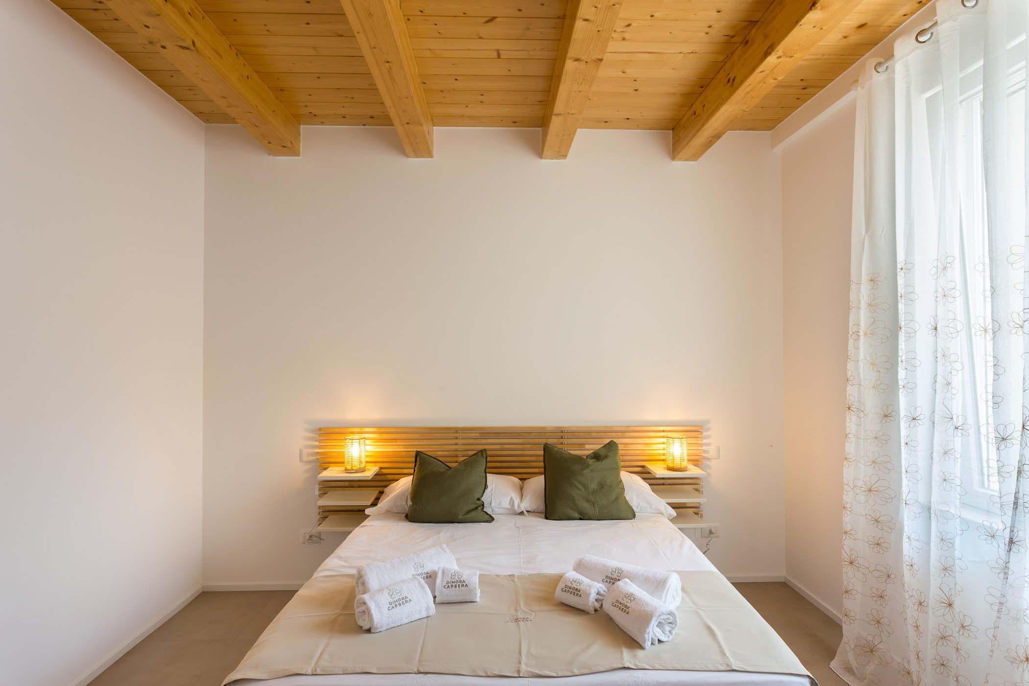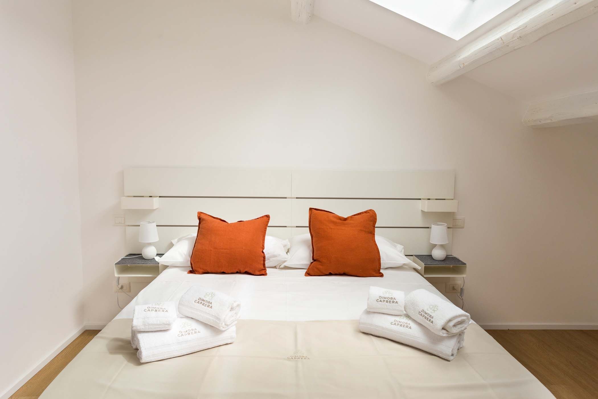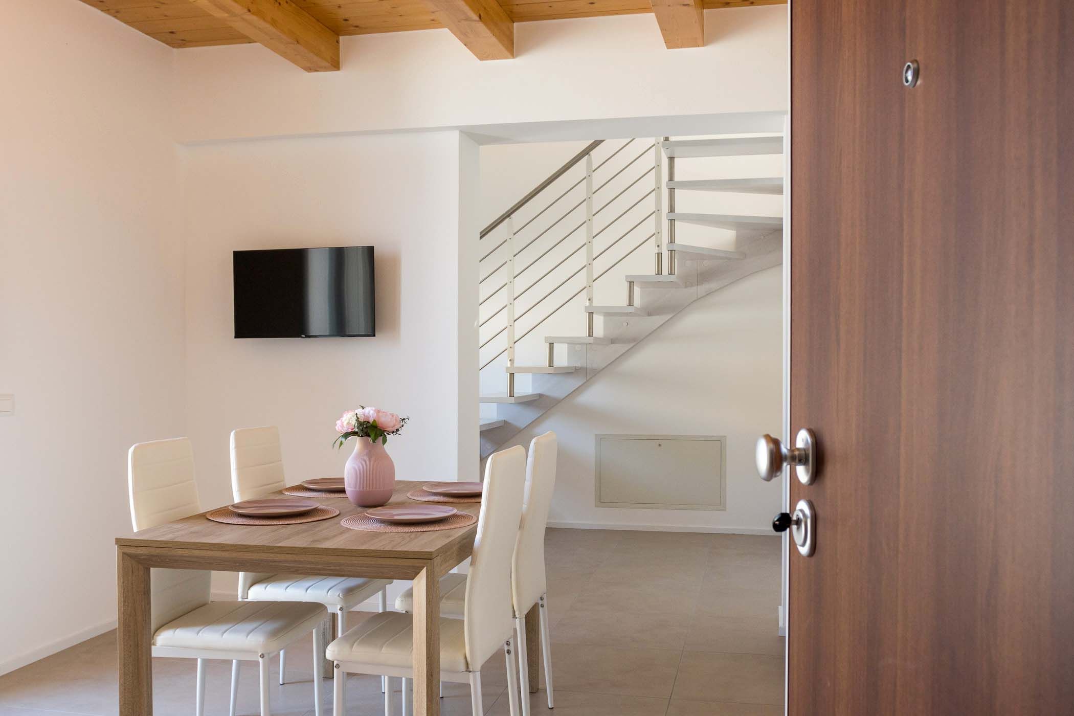 Elegante appartamento, con accesso da ingresso condominiale, posto al primo piano. L’ingresso conduce ad un’ampia zona giorno, che unisce soggiorno e cucina con accesso diretto al terrazzo. Completa il piano una camera matrimoniale con balcone e un bagno. La comoda scala interna porta al piano superiore, dove si trovano due spaziose camere matrimoniali, di cui una con due letti singoli unibili a seconda delle esigenze. Entrambe le camere sono dotate di finestre Velux automatizzate con tendine oscuranti, che garantiscono luminosità naturale regolabile. A questo piano si trova anche un bagno e l’accesso ad un’ampia terrazza prendisole, ideale per momenti di convivialità e relax sotto il sole. Lenzuola e asciugamani sono forniti.