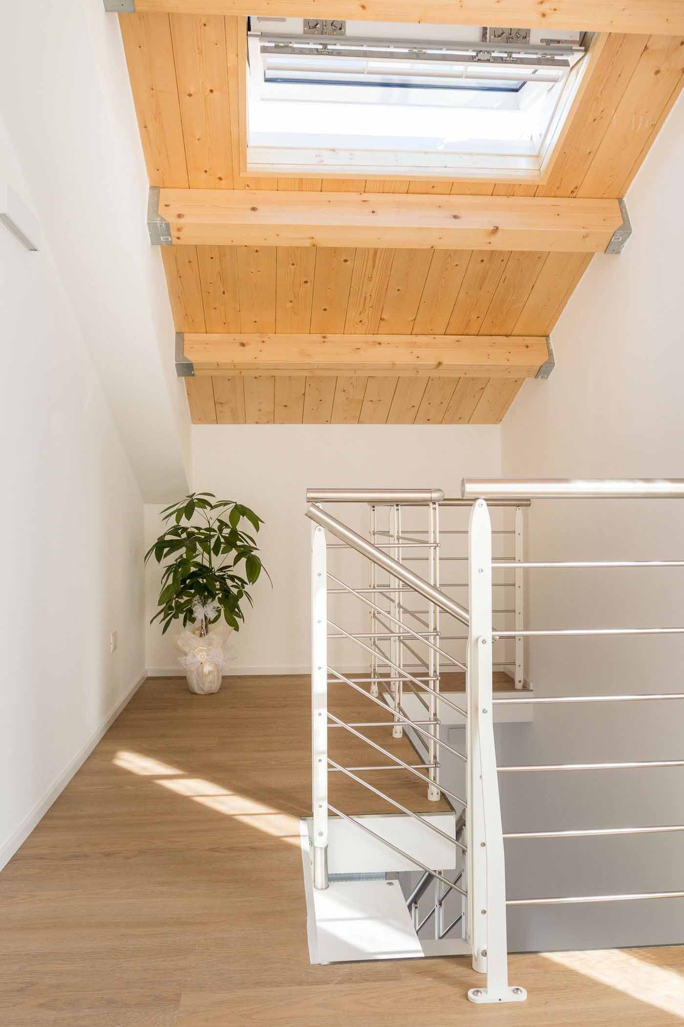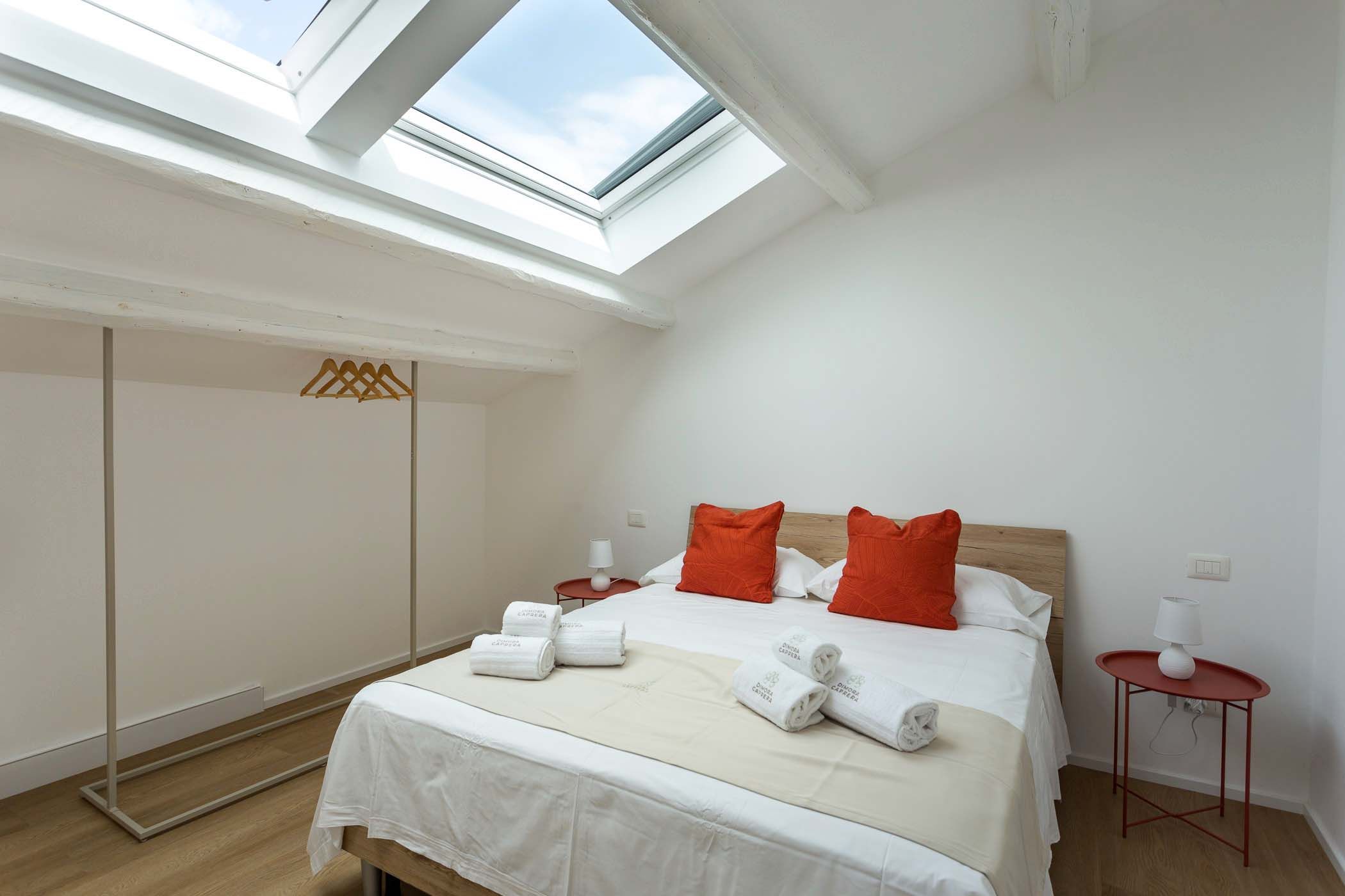 Una scala interna conduce al piano sottotetto, dove si trovano due camere matrimoniali dotate di finestre Velux automatizzate con tendine oscuranti, che garantiscono luminosità naturale regolabile. Presente un secondo bagno, anch’esso dotato di doccia e bidet.