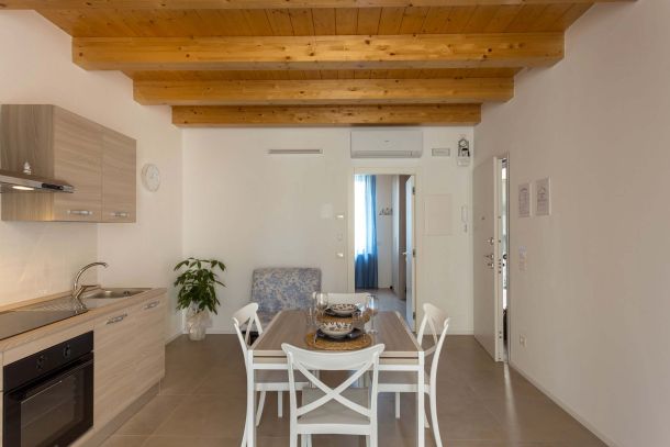 L’ingresso si apre su un’area living attrezzata, dotata di divano letto a due posti, smart TV e ambiente cucina munito di tutte le dotazioni necessarie per un uso quotidiano.