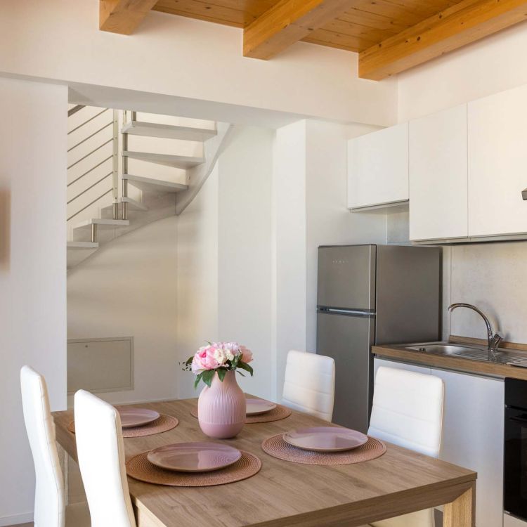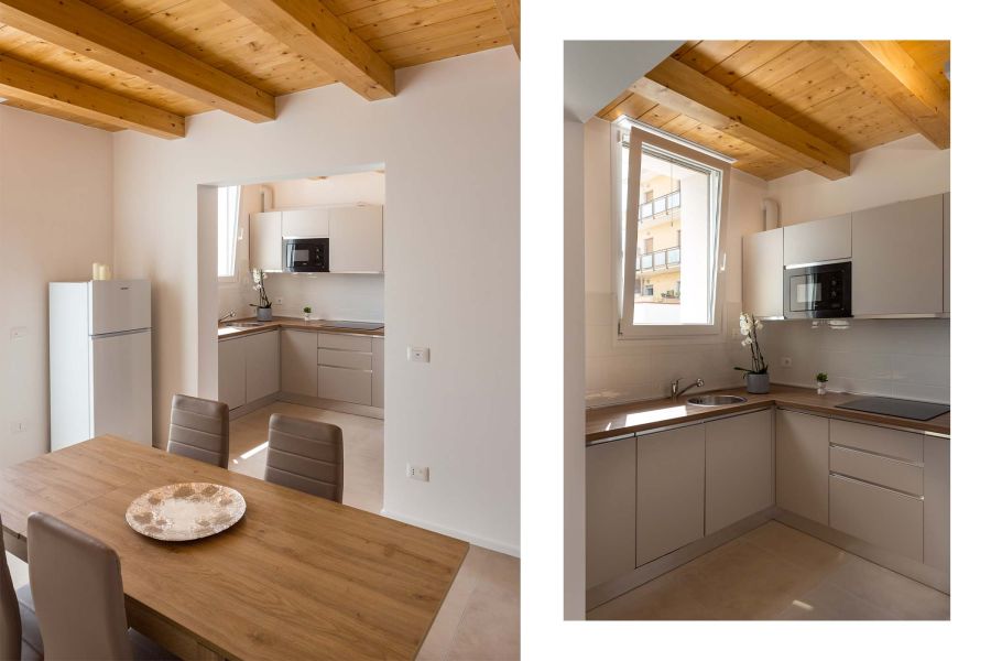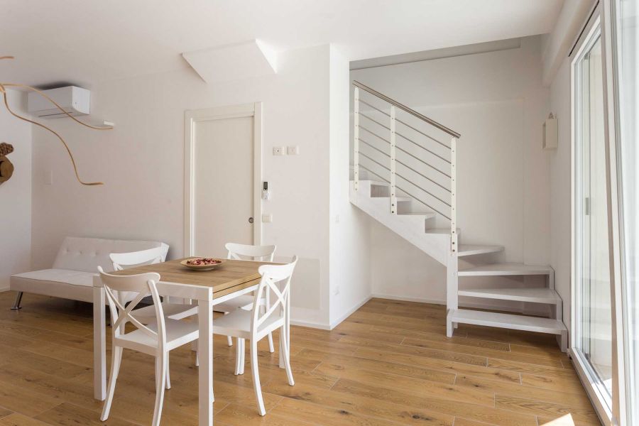Elegante appartamento, con accesso da ingresso condominiale, posto al primo piano. L’ingresso conduce ad un’ampia zona giorno, che unisce soggiorno e cucina con accesso diretto al terrazzo. Completa il piano una camera matrimoniale con balcone e un bagno. La comoda scala interna porta al piano superiore, dove si trovano due spaziose camere matrimoniali, di cui una con due letti singoli unibili a seconda delle esigenze. Entrambe le camere sono dotate di finestre Velux automatizzate con tendine oscuranti, che garantiscono luminosità naturale regolabile. A questo piano si trova anche un bagno e l’accesso ad un’ampia terrazza prendisole, ideale per momenti di convivialità e relax sotto il sole. Lenzuola e asciugamani sono forniti.