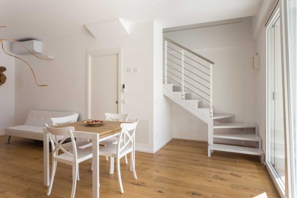 Elegante appartamento, pensato per soggiorni brevi all’insegna del comfort e della funzionalità. Gli ambienti, caratterizzati da pavimentazione in gres e riscaldamento a pavimento, offrono un’atmosfera accogliente e contemporanea. Situato al primo piano con accesso da ingresso condominiale, l’appartamento dispone di un ampio soggiorno con divano letto matrimoniale e accesso a due balconi e una cucina completamente accessoriata. Una porta scorrevole consente di suddividere il soggiorno in due ambienti separati, creando all’occorrenza un’ulteriore camera da letto. Il piano è completato da un bagno con doccia e bidet. Una scala interna conduce al piano sottotetto, dove si trovano due camere matrimoniali dotate di finestre Velux automatizzate con tendine oscuranti, che garantiscono luminosità naturale regolabile. Presente un secondo bagno, anch’esso dotato di doccia e bidet.